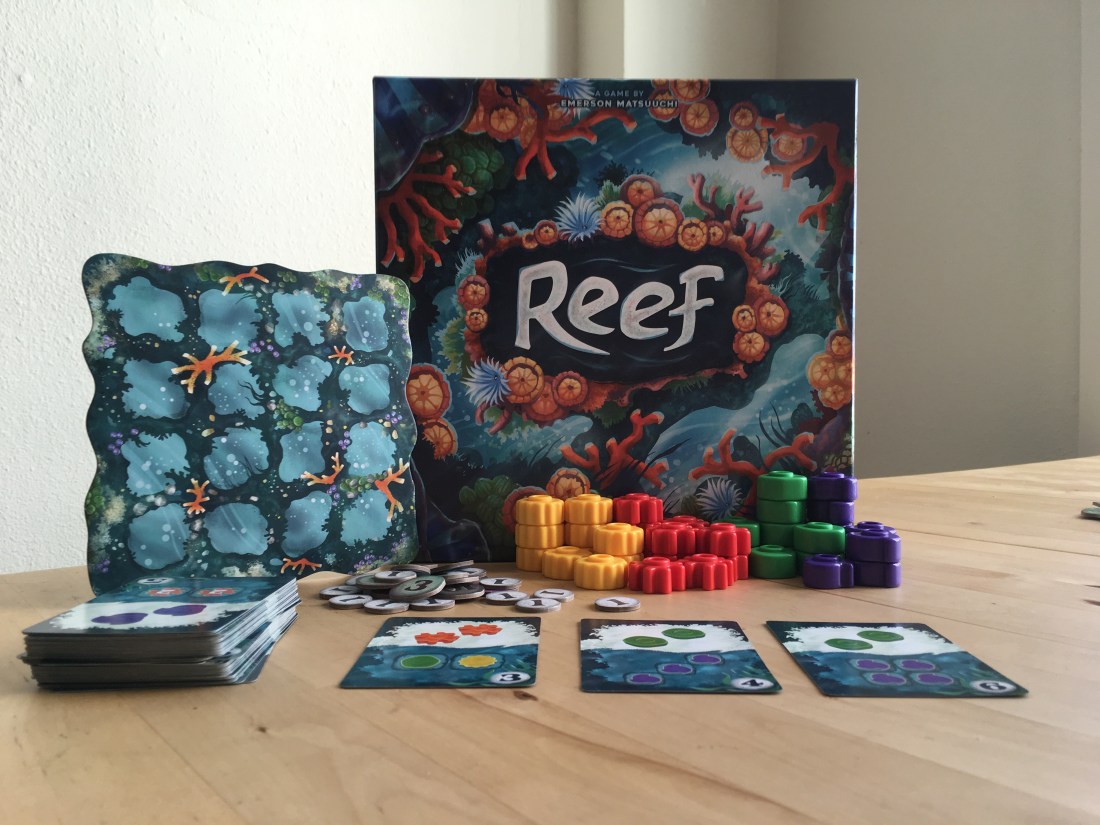 Reef is a tile laying game I love because it is also a card game: you draft cards from a river and play them to gather and place coral, then score the coral formation on the same card. It is in the same product line as Azul- but where Azul is pure tile-drafting, Reef … Continue reading Reef: A Colorful Coral Construction Favorite