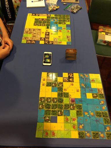Technically it was a mixed game, containing both Kingdomino tiles and Queendomino tiles. Queendomino is a gamified, slightly more complicated variant, and adding one set of it to two sets of Kigdomino tiles let me run the game. Also made it wildly unbalanced. And incredibly fun, although you never know how much fun is really sleep deprivation when you don’t wrap a game until six in the morning. We were the only gamers left in the football stadium they open up for the con. A security gaurd came over just to ask what was keeping us going. The team I demo with has already, (CGE imps!), asked for a repeat this year.